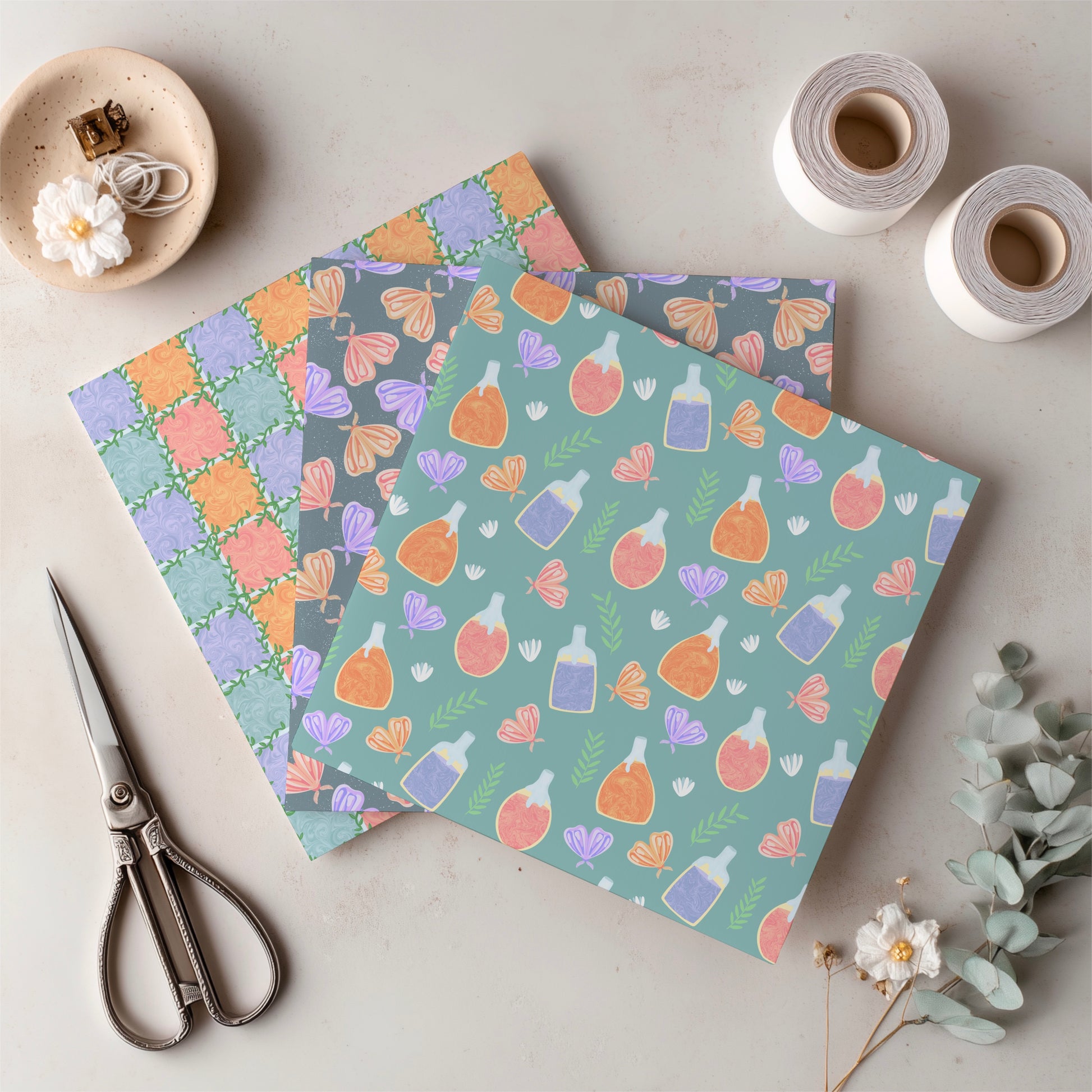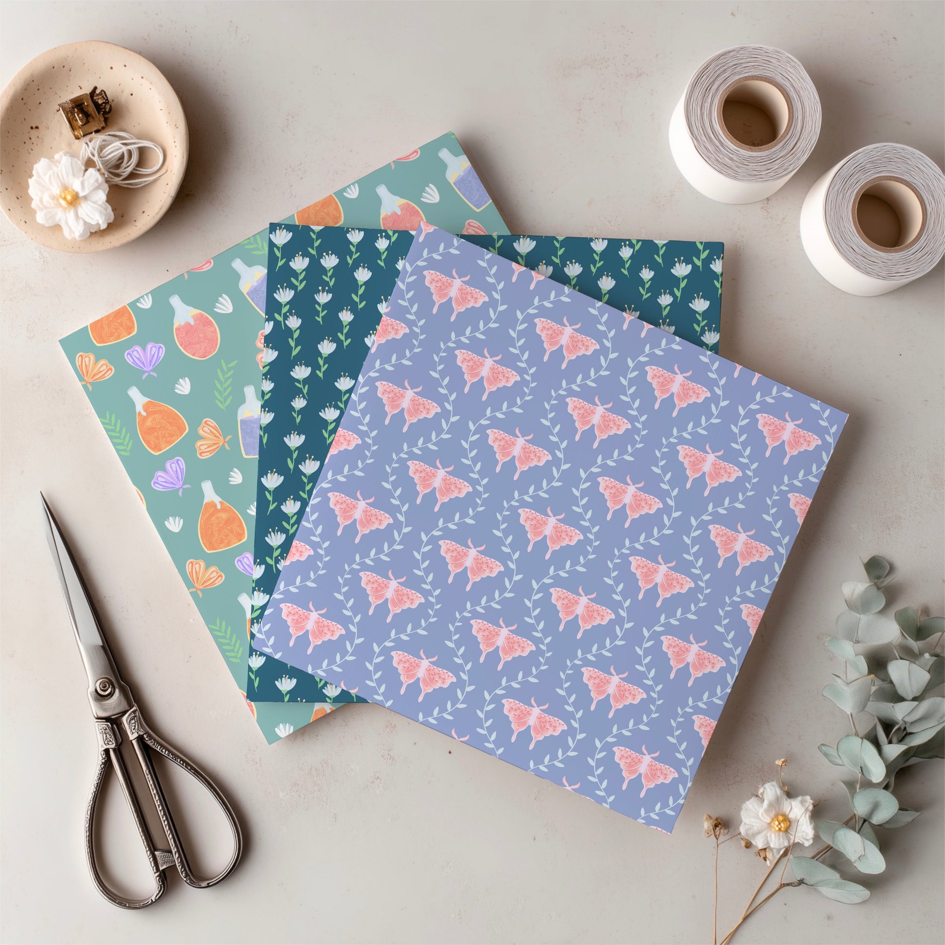 Step into a world of wonder with this Enchanted Whimsy Digital Paper Pack, where delicate moths, mystical potions, and lush botanicals dance together in dreamy, whimsical designs 🌙✨🦋. Perfect for scrapbook lovers, journal makers, card crafters, and anyone who adores a touch of magical charm, these seamless backgrounds will instantly elevate your creative projects with an enchanting aesthetic.