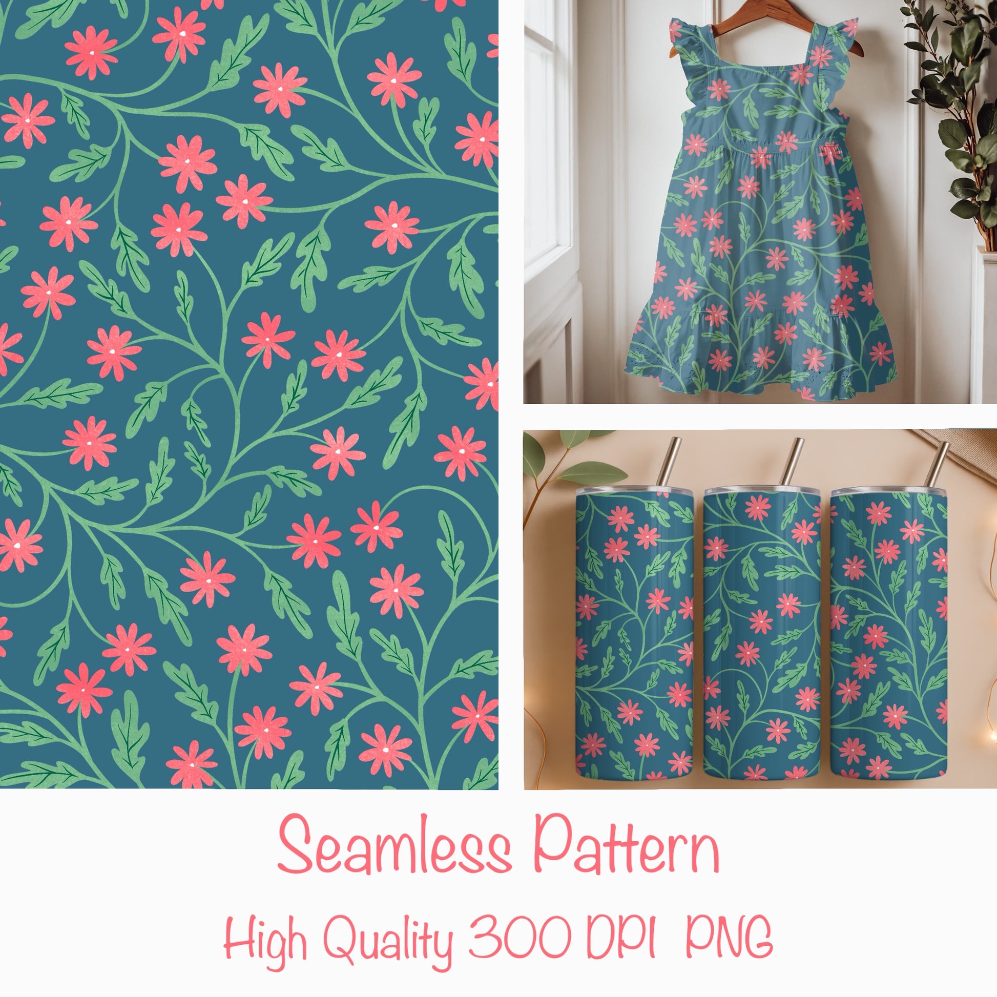 Featuring delicate flowers intertwined with flowing greenery, this high-quality seamless repeat design tiles effortlessly and is ideal for print-on-demand, sublimation, digital paper, stationery, planners, apparel, mugs, wrapping paper, and spring-inspired décor.