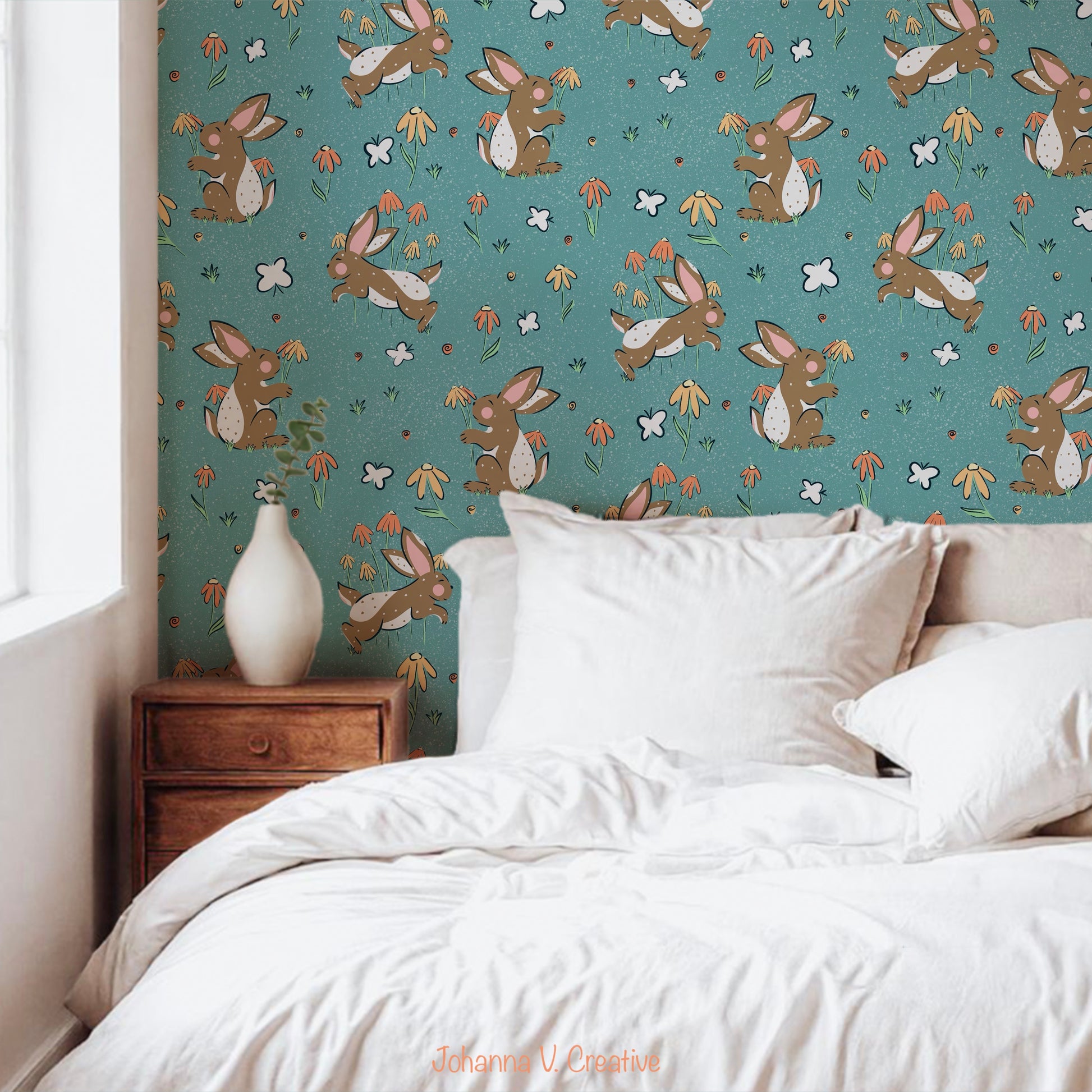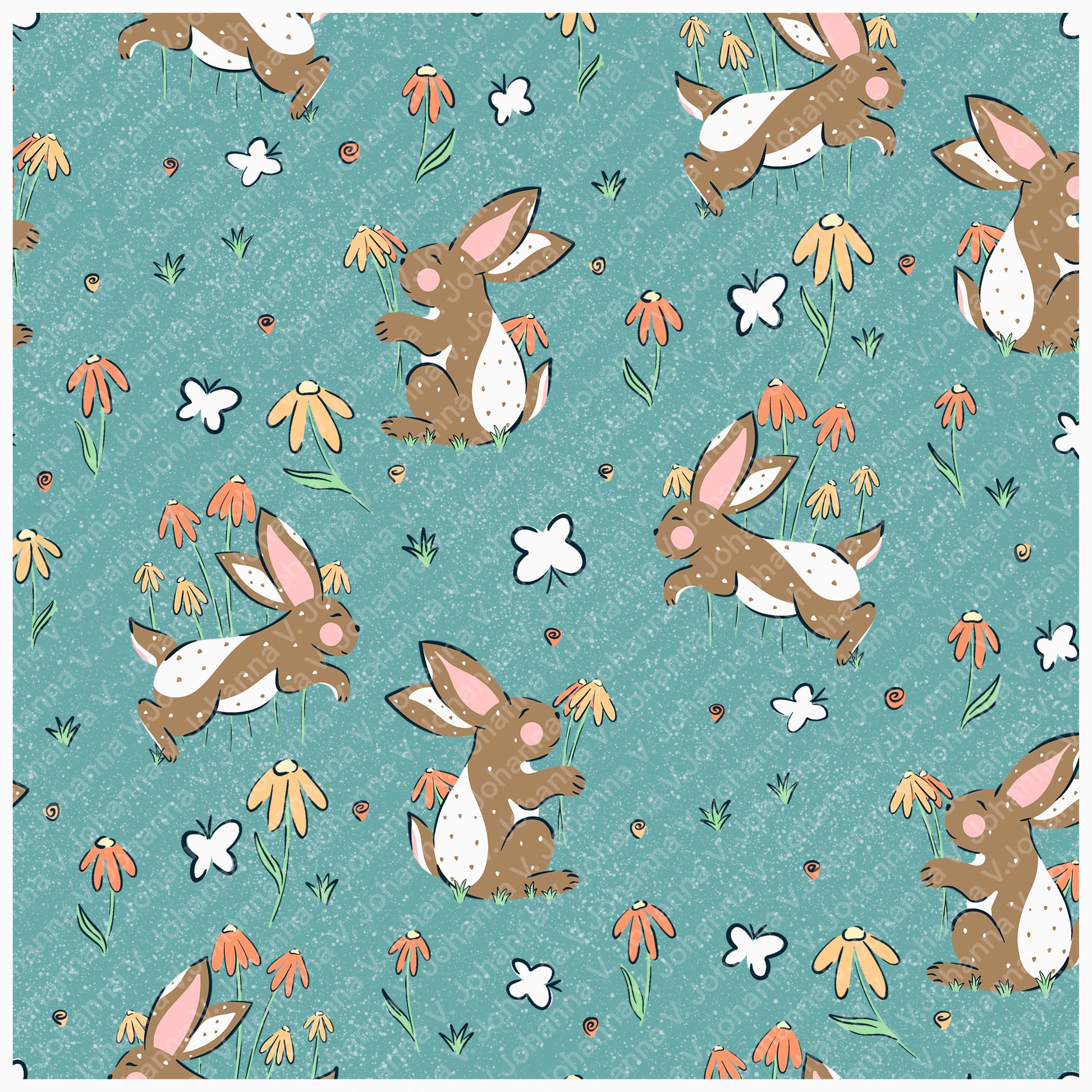 This seamless bunny and floral pattern blends playful charm with delicate botanical beauty, creating a design that feels cozy, cheerful, and timeless.