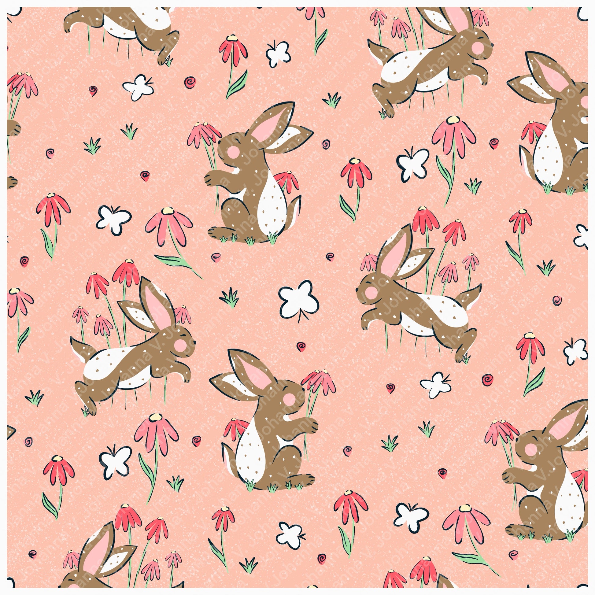 Seamless Bunny Floral Pattern Peach | Spring Bunnies & Flowers | Cute Digital Paper PNG for Sublimation & POD