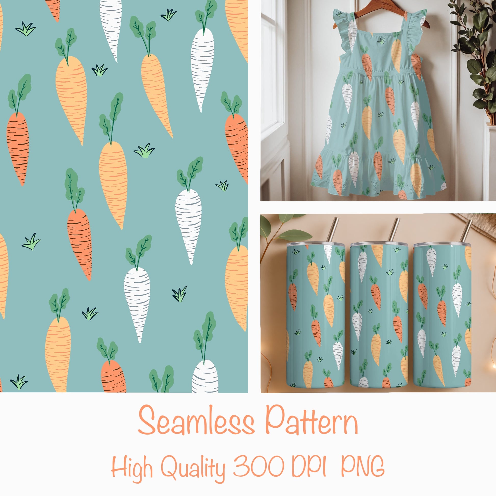 Featuring illustrated carrots arranged in a seamless repeat, this high-quality design tiles effortlessly and works beautifully for print-on-demand, sublimation, digital paper, stationery, planners, apparel, mugs, gift wrap, and seasonal décor.