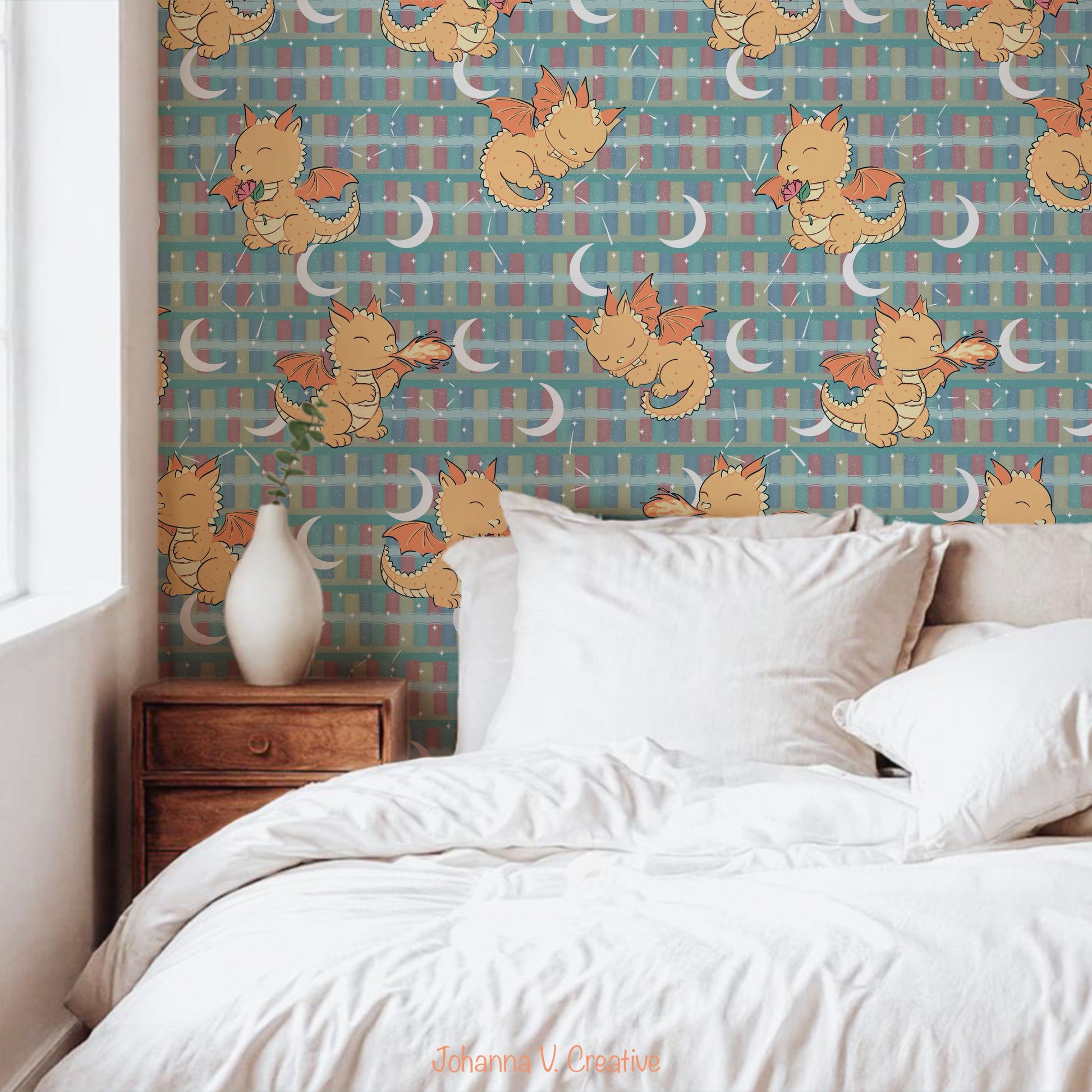 This seamless fantasy bookshelf pattern blends cozy literary charm with magical wonder, featuring bookshelves guarded by dragons, glowing stars, and crescent moons.