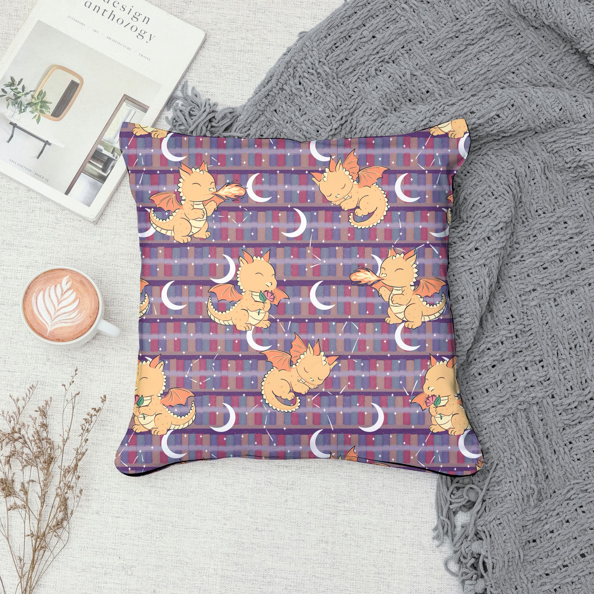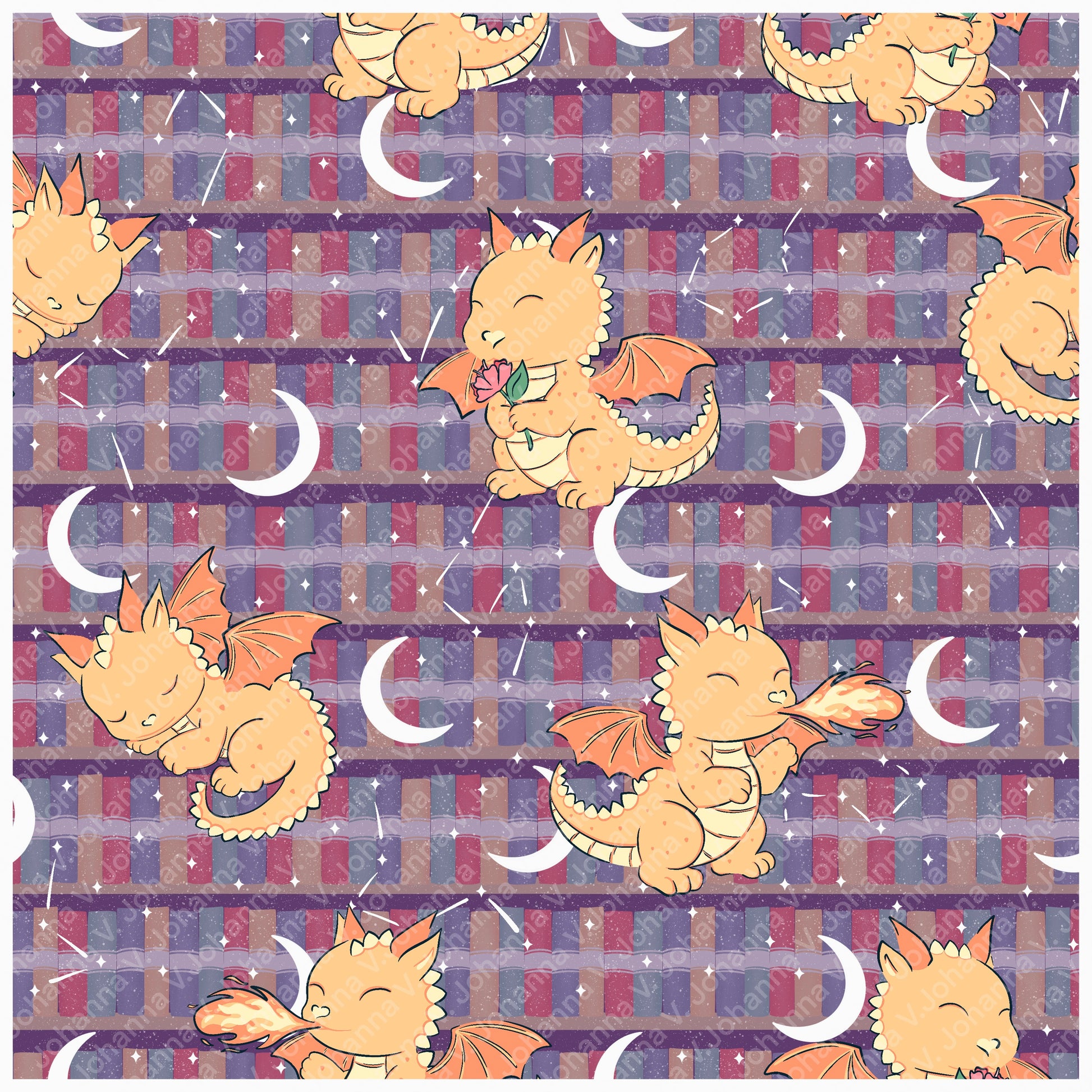 This seamless fantasy bookshelf pattern blends cozy literary charm with magical wonder, featuring bookshelves guarded by dragons, glowing stars, and crescent moons.
