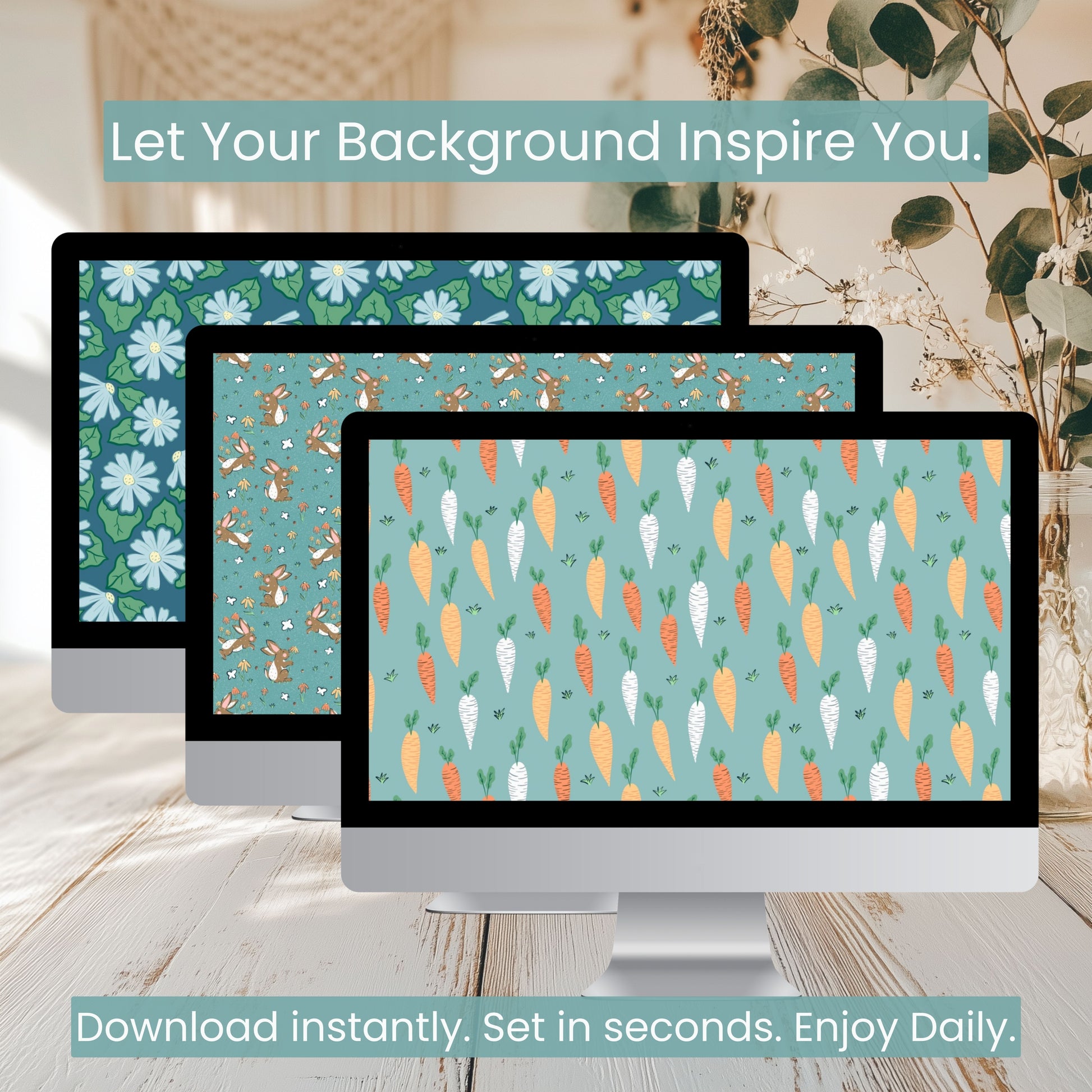 Spring Wallpaper Bundle of 3 Blue | Bunnies, Carrots, Floral Phone, Tablet & 4K Desktop Backgrounds | Instant Digital Download