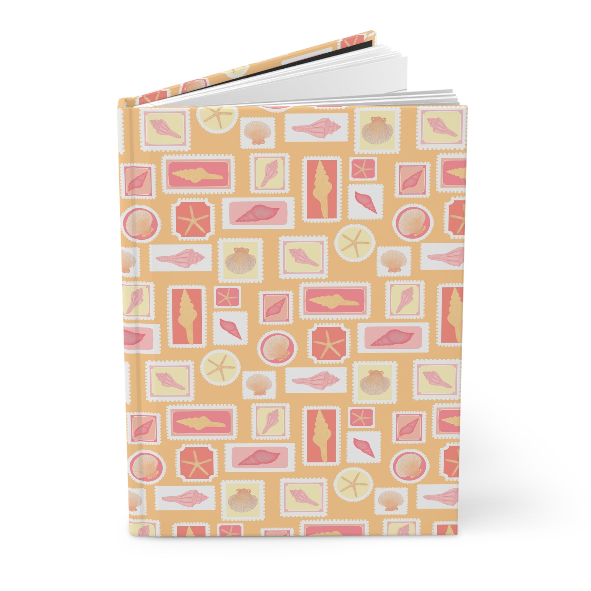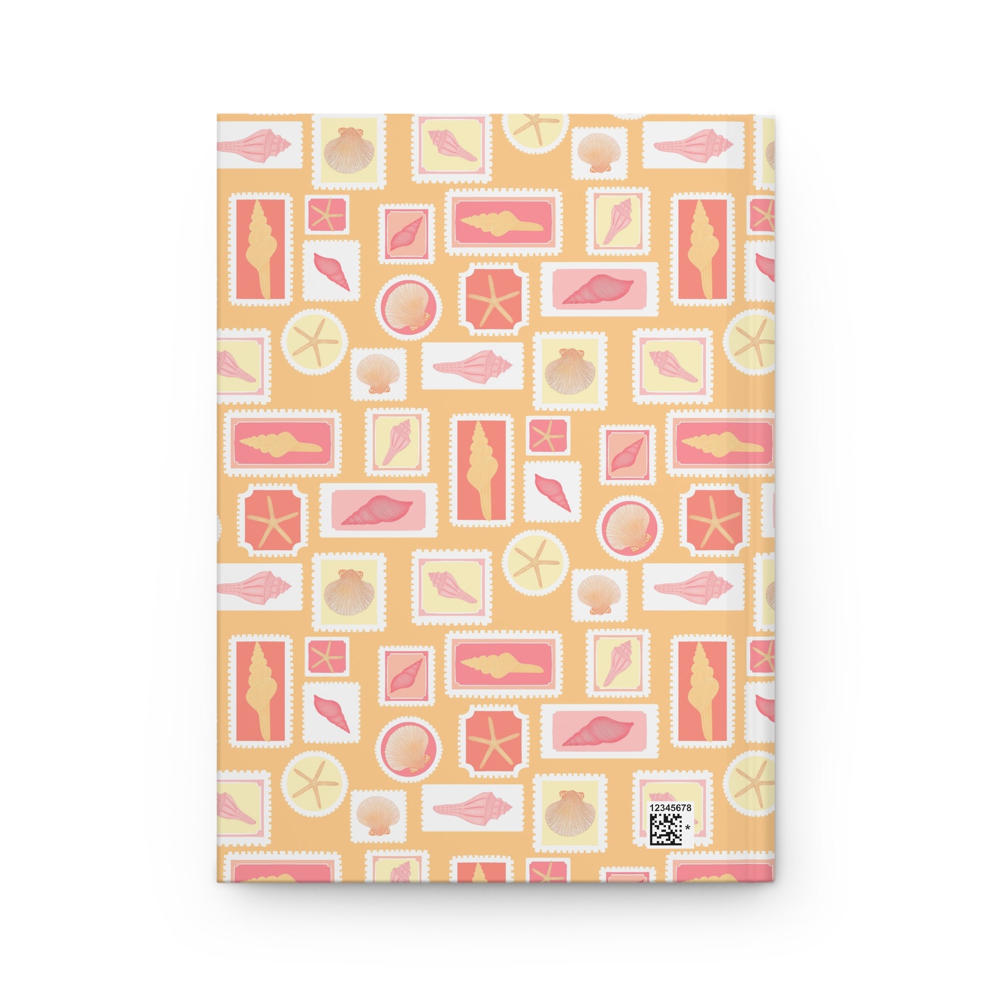 This coastal journal features a playful collection of seashells and starfish framed like vintage postage stamps, set against a warm orange background that feels like golden hour by the sea. Bright, nostalgic, and full of charm, it captures the feeling of long beach days and soft summer evenings.